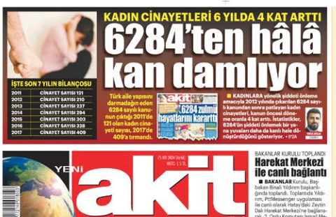 Ailelerin dağılmasına neden olan 6284 gibi yanlış hukuk maddelerine vurgu yapan gazetemiz Akit, kadın cinayetlerinin 6 yılda 4 kat artmasını “6284’ten hâlâ kan damlıyor” manşetiyle gündeme taşıdı. “6284’ün mimarı CHP”, “10 yılda 1 milyon 200 bin çift boşandı”, “Yuvası dağılan çocuklar suça karışıyor”, “Ahlaksız diziler aileyi dinamitliyor”, “Zina toplumu yaktı aileyi yıktı” manşetleriyle gazetemiz, Türkiye’nin yarınlarının teminatı olan aile birliğini çatırdatmaya yönelik tuzaklara büyük yer ayırdı. Feminazi oluşumu olan ve kamuoyunda ‘Mor Çete’ olarak anılan Mor Çatı Vakfı, aile bütünlüğünü savunarak 6284 garabetine vurgu yaptığımız haberlere ilişkin açıklama yayınlayarak Akit’in susturulmasını istedi.