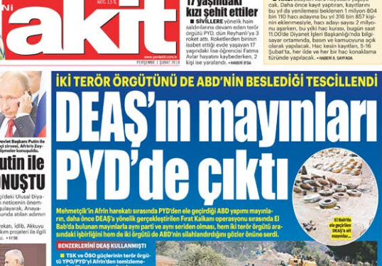 Karanlık odaklarca düğmesine basılan çevrelerin hedef tahtasındaki Akit, Türkiye düşmanlığında yarışan terör örgütlerini bir bir ifşa etti. Özellikle şubat ayının gündemini tek başına belirleyen Akit, 1 Şubat’ta “DEAŞ’ın mayınları PYD’den çıktı” manşetiyle okurlarının karşısına çıktı. DEAŞ’ın el-Bab’da TSK’ya karşı kullandığı mayınların aynılarının Afrin’de PKK/PYD tarafından da kullanıldığının ortaya çıkarıldığı haber, iki terör örgütünü de ABD’nin beslediğini tescilledi. Akit; “Firavun PYD zulmünü görse utanırdı”, “Nazi torunlarının PKK/PYD aşkı”, “YPG’yi silahlandıran ABD yargılanacak”, “Suriye bataklığı ABD’yi boğacak”, “Katil sürüsünün kirli ittifakı” manşetleriyle Suriye PKK’sının maskesini indirdi, ABD ve Batılı ülkelerin teröre verdiği desteği tarihe not düştü.