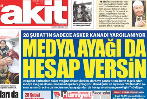 Akit, 28 Şubat darbecilerinin de peşini bırakmadı. Akit, Türkiye’nin gelişimini sekteye uğratan, milli iradeyi yok sayan, Kur’an kurslarını kapatan, başörtülülere hayatı zindan eden 28 Şubatçı zalimlerin hesap vermesi için ısrarlı yayınlarını sürdürdü. Gazetemizin “Medya ayağı da hesap versin”, “28 Şubat’ın sermaye ayağı hesap vermeli” “İşte 28 Şubat’ın acı bilançosu” manşetleri cuntacıları hoplattı.