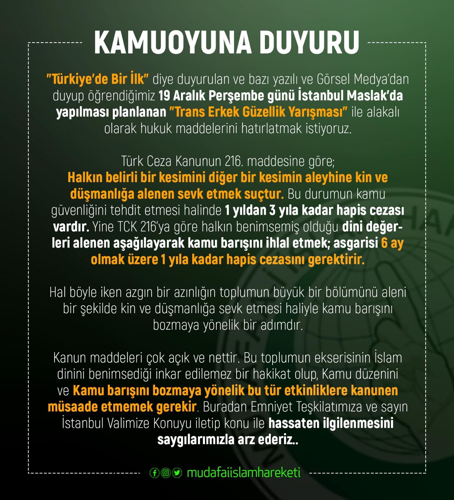 Yapılması planlanan trans güzellik yarışmasına ilişkin açıklamalarda bulunan Müdafa-i İslam Hareketi Genel Başkanı Erdem Özveren şunları söyledi: