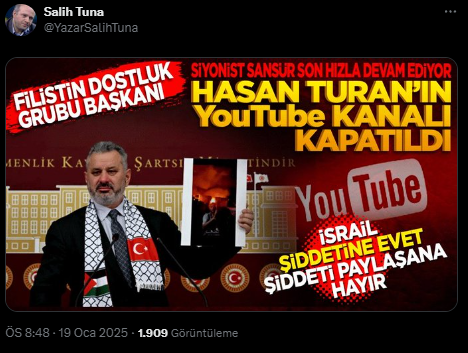 TBMM Filistin Dostluk Grubu Başkanı İstanbul Milletvekili Hasan Turan sosyal medya hesabından Filistin davasını anlattığı video nedeniyle YouTube kanalının kapatıldığını açıkladığımız haber sonrası bazı TV kanallarında ve köşe yazılarında Youtube için tepkiler gelmeye başladı.