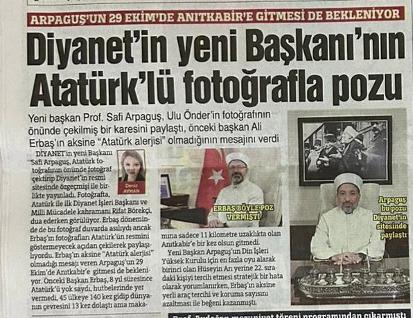 Sözcü, önceki Başkan Ali Erbaş döneminde de odada yer alan tabloyu gizlemek için fotoğrafı bilgisayarda kırparak servis etti. Gazete, yeni başkan üzerinden “Atatürk alerjisi yok” mesajı verilmeye çalışıldığını öne sürerek Arpaguş’un 29 Ekim’de Anıtkabir’e gitmesini beklediğini yazdı, ayrıca Erbaş döneminde hutbelerde Mustafa Kemal’in adının zikredilmediğini hatırlatıp yeni başkana rota çizmeye kalkıştı.