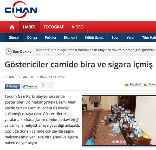 Tarih: 3 Haziran 2013/ Cihan Haber Ajansı: “Göstericiler camide bira ve sigara içmiş”