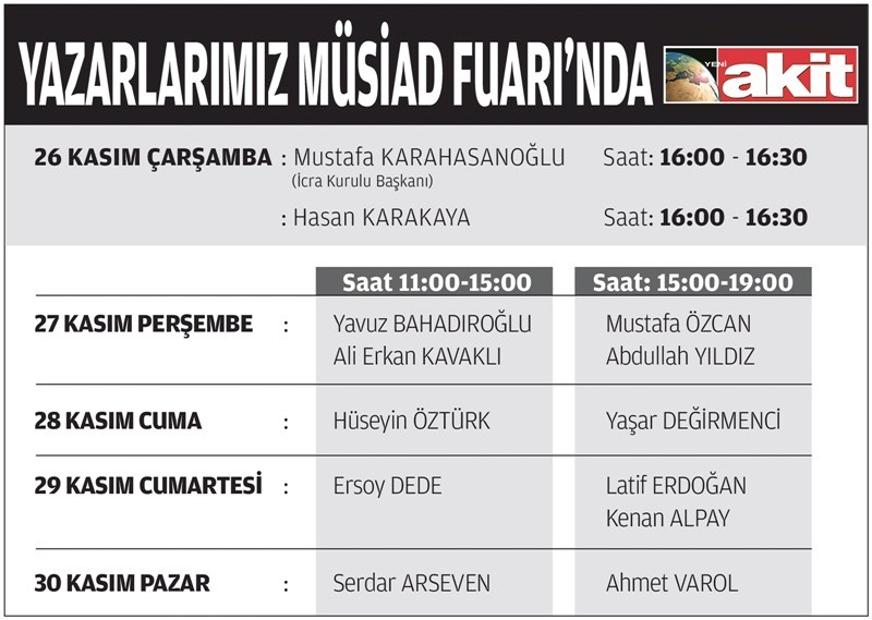 26-30 Kasım tarihleri arasında gerçekleştirilecek olan 15. Uluslararası MÜSİAD Fuarı'na gazetemiz Akit de katıldı. İstanbul Yeşilköy'deki CNR Expo'da düzenlenen fuarda standı bulunan gazetemiz, yazarlarını da okurları ile buluşturacak.
