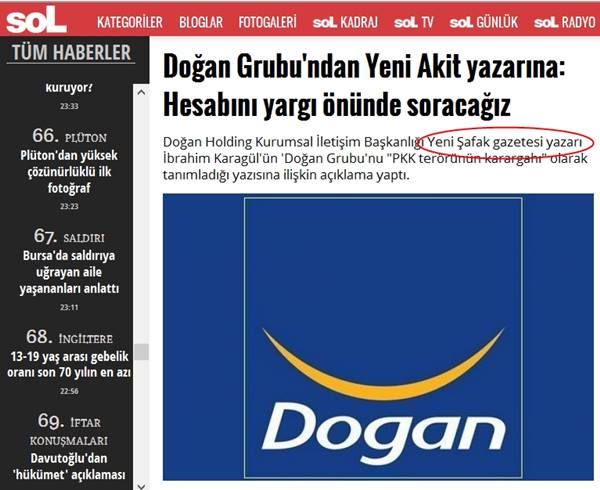 YENİAKİT.COM.TR - Batık gazete Sol'un Akit takıntısı bir gülünç duruma daha yol açtı. Her fırsatta gazetemiz Akit'e saldıran ve ufak çaplı haberleriyle marka değerimiz üzerinden prim yapmaya çalışan Sol adlı düşük site, "Doğan Grubu'ndan Yeni Akit yazarına: Hesabını yargı önünde soracağız" başlıklı haberinde yine komik duruma düştü. Başlıkta 'Akit yazarı' tabirini kullanan Sol, haberin spot ve içeriğinde ise Yenişafak yazarı İbrahim Karagül'den bahsetti. Sol'daki haberin spotunda "Doğan Holding Kurumsal İletişim Başkanlığı Yeni Şafak gazetesi yazarı İbrahim Karagül'ün 'Doğan Grubu'nu 'PKK terörünün karargahı' olarak tanımladığı yazısına ilişkin açıklama yaptı." ifadeleri kullanıldı.
