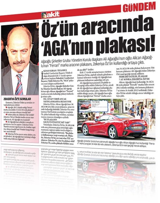 Akit'te yer alan haberde; İstanbul Cumhuriyet Başsavcı Vekili olduğu dönemde 17 Aralık darbe operasyonunu başlatan Zekeriya Öz'ün, Alican Ağaoğlu'nun 34 AGA 86 nolu lüks aracın plakasını uzun süredir kullandığı ortaya çıkarılmıştı.