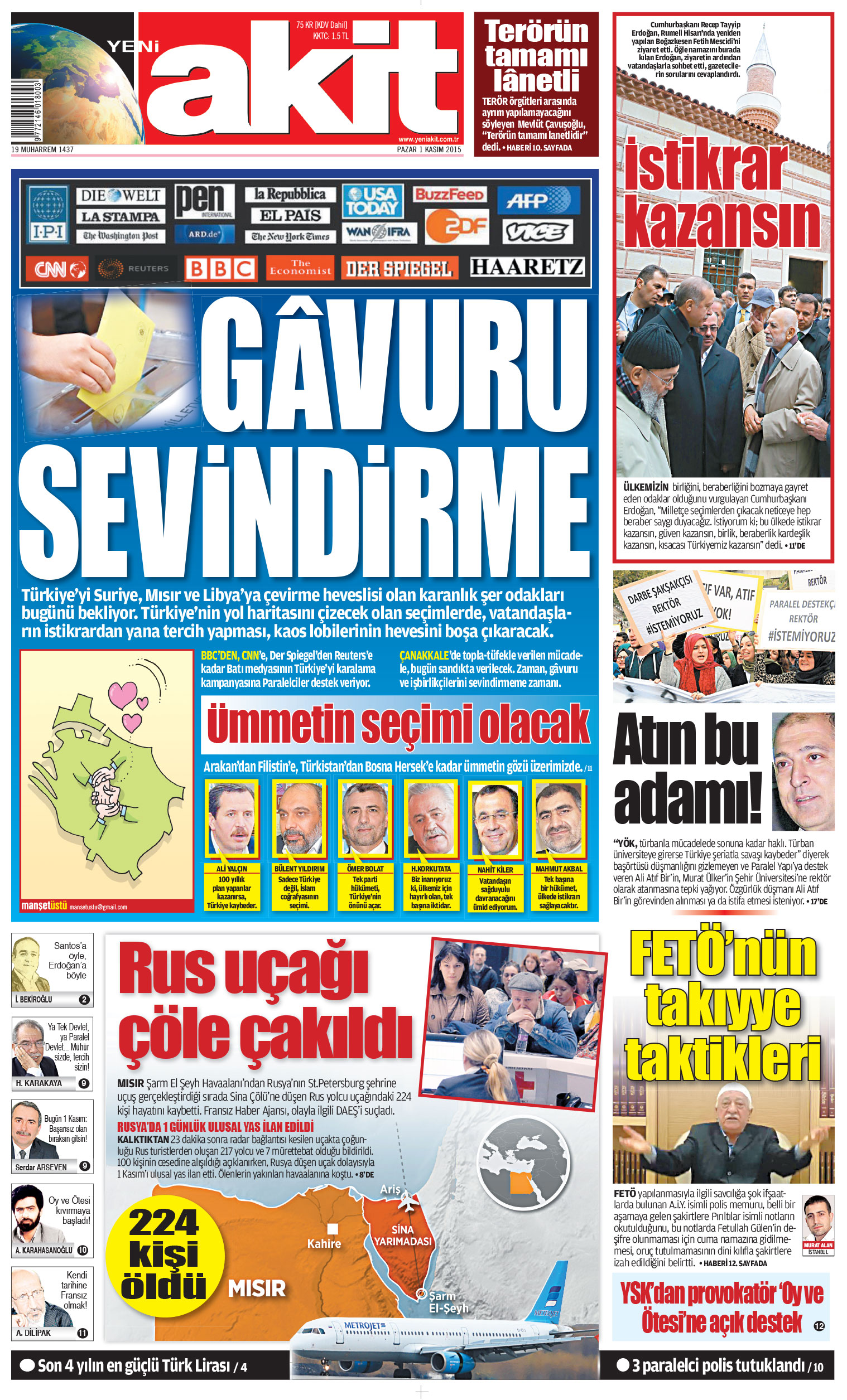 Yazı İşleri personelimizin hazırladığı haberleri değerlendiren Akit Yayın Kurulu ise 1 ve 2 Kasım tarihlerinde aşağıdaki 1. sayfalarla okuyucunun karşısına çıktı: