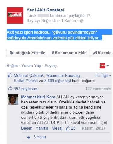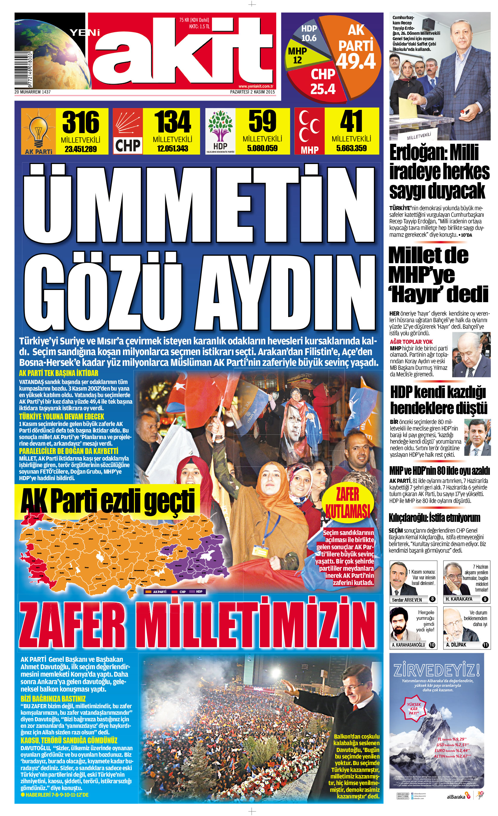Akit Ailesi olarak, ezici bir üstünlükle yeniden tek başına iktidara gelen AK Parti ve kadrosu ile 'gâvuru sevindirmeyen' sağduyulu milletimizi tebrik ediyor; hayırcılarla, paralelcilerle ve bölücülerle mücadelenin hız kesmeden devam etmesini temenni ediyoruz.