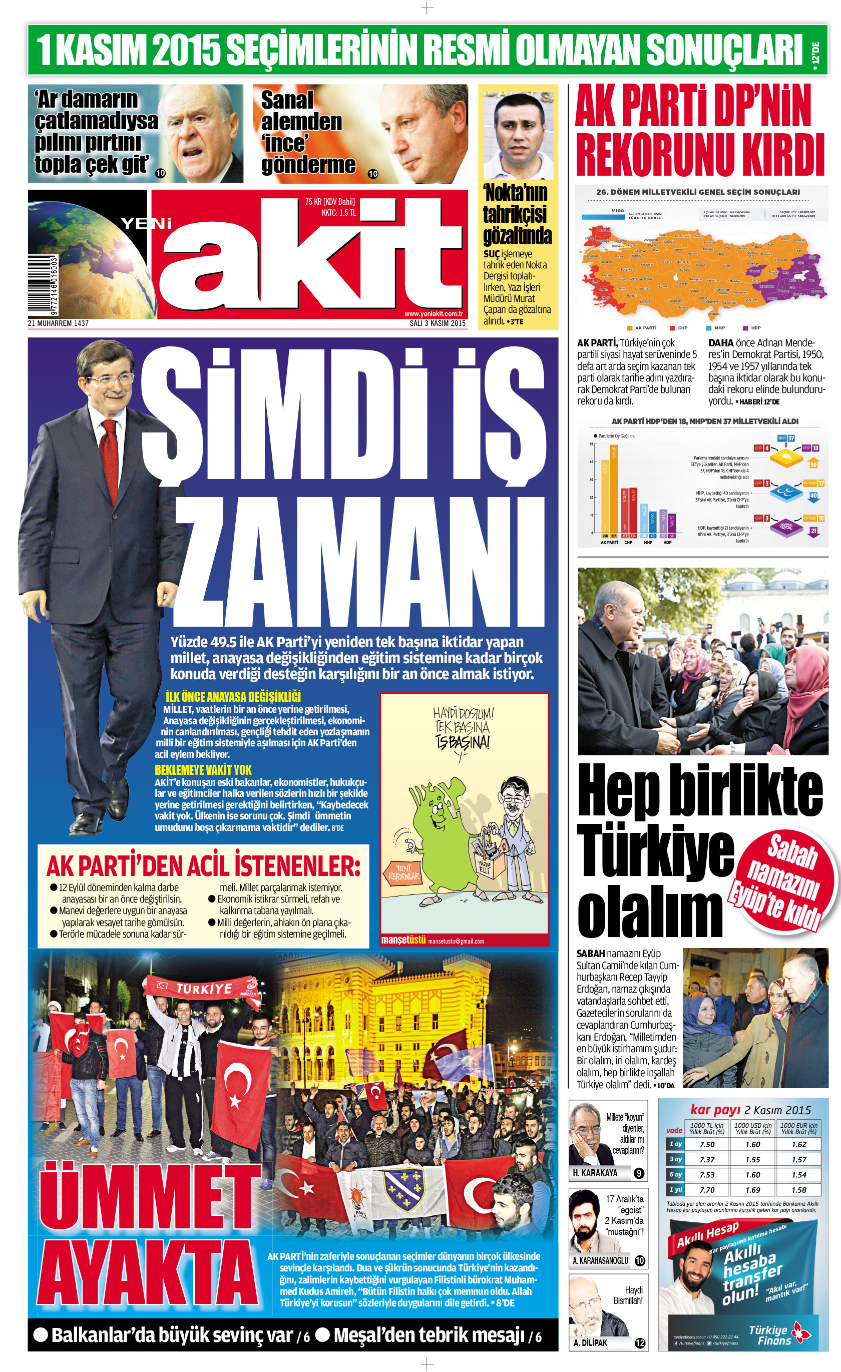 Seçim sonuçlarının tv ekranlarına yansımasıyla tüm Türkiye ile birlikte ekrana kilitlenen ve ajanslardan gelen bilgileri seri bir biçimde takip eden kadromuz, 2 Kasım gününün gazetesinin hazırlıklarını tamamlayarak "Ümmet'in sevinci"ne dikkat çeken bir 1. sayfa hazırladı.