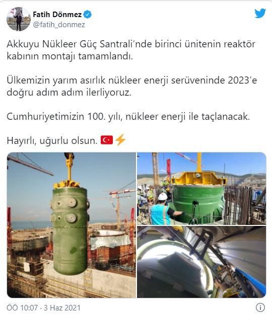Akkuyu NGS'de yeni bir aşama daha tamamlandı. Gelişmeyi duyuran Enerji ve Tabii Kaynaklar Bakanı Fatih Dönmez Twitter hesabından şöyle yazdı: