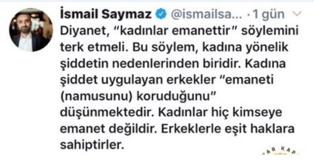 'Gazeteci' İsmail Saymaz, Peygamber Efendimiz Hz. Muhammed (S.A)'ın Veda Hutbesi'nde söylediği "Kadınlar size Allah'ın emanetidir" sözlerine ilişkin, Twitter hesabından yaptığı "Kadına şiddet uygulayan erkekler 'emaneti (namusunu) koruduğunu' düşünmektedir. Bu söylem, kadına yönelik şiddetin nedenlerinden biridir." paylaşımına bir twitter kullanıcısının verdiği cevapla neye uğradığını şaşırdı. Saymaz'ın takipçisi, "İslamdaki 'emanet' kavramı, bir şeyin size ait olmadığını, sizin malınız mülkünüz olmadığını ifade etmek için kullanılır." dedi ve ekledi: "Gerizekalıya anlatır gibi anlattım. Artık anla"