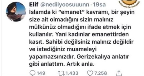 "İslamdaki 'emanet' kavramı, bir şeyin size ait olmadığını sizin malınız mülkünüz olmadığını ifade etmek için kullanılır. Yani kadınlar emanettirden kasıt, 'Sahibi değilsiniz. Malınız değildir ve istediğiniz muameleyi yapamazsınız'dır. Gerizekalıya anlatır gibi anlattım. Artık anla."