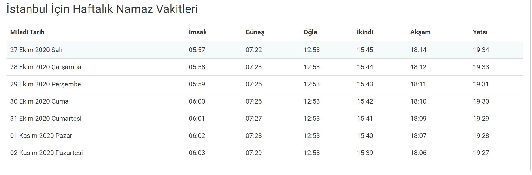 İstanbul Haftalık Akşam Namazı Vakitleri