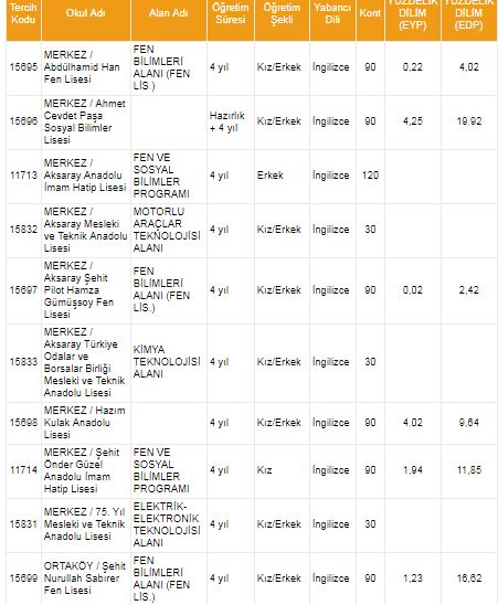 Aksaray lise taban puanları YEP yüzdelik dilimleri kontenjanları 2018 2019