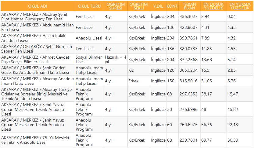 Aksaray liseleri taban puanı 2021 Aksaray liseleri başarı sıralaması |Aksaray liseleri kontenjanları