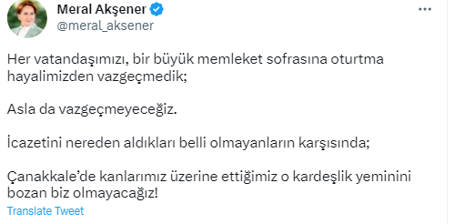 Akşener, paylaşımında, "Her vatandaşımızı, bir büyük memleket sofrasına oturtma hayalimizden vazgeçmedik; Asla da vazgeçmeyeceğiz. İcazetini nereden aldıkları belli olmayanların karşısında; Çanakkale’de kanlarımız üzerine ettiğimiz o kardeşlik yeminini bozan biz olmayacağız!" dedi.