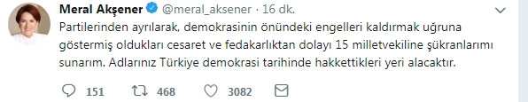 İYİ Parti'yi seçimlere sokabilmek için bizatihi Kemal Kılıçdaroğlu'nun talimatlarıyla CHP'den İYİ Parti'ye geçen vekiller partilerine geri döndüler. Meral Akşener, CHP'ye dönen 15 vekil için teşekkür paylaşımı yaptı.