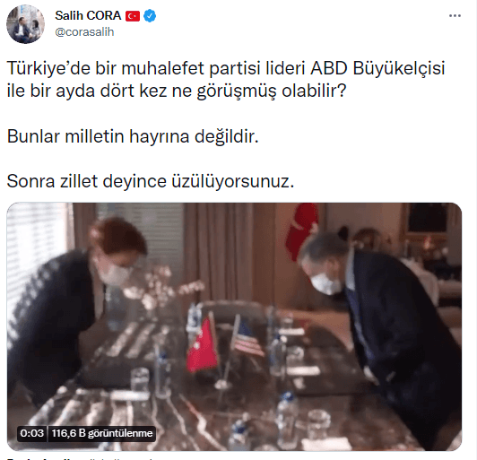 İYİ Parti Genel Başkanı Meral Akşener'in ABD'nin Ankara Büyükelçisi David M. Satterfield ile gizemli bir şekilde görüşmesine AK Parti Trabzon Milletvekili Salih Cora "Türkiye’de bir muhalefet partisi lideri ABD Büyükelçisi ile bir ayda dört kez ne görüşmüş olabilir? Bunlar milletin hayrına değildir. Sonra zillet deyince üzülüyorsunuz." sözleriyle tepki gösterdi.