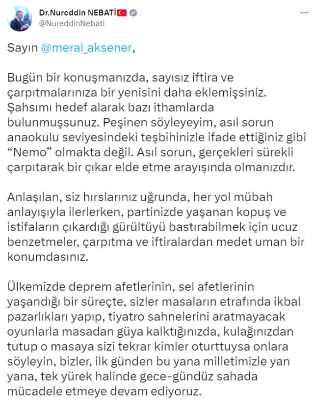 "Sayın Meral Akşener, bugün bir konuşmanızda, sayısız iftira ve çarpıtmalarınıza bir yenisini daha eklemişsiniz. Şahsımı hedef alarak bazı ithamlarda bulunmuşsunuz. Peşinen söyleyeyim, asıl sorun anaokulu seviyesindeki teşbihinizle ifade ettiğiniz gibi "Nemo" olmakta değil. Asıl sorun, gerçekleri sürekli çarpıtarak bir çıkar elde etme arayışında olmanızdır.