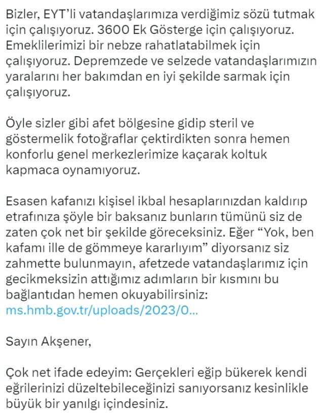Anlaşılan, siz hırslarınız uğrunda, her yol mübah anlayışıyla ilerlerken, partinizde yaşanan kopuş ve istifaların çıkardığı gürültüyü bastırabilmek için ucuz benzetmeler, çarpıtma ve iftiralardan medet uman bir konumdasınız. Ülkemizde deprem afetlerinin, sel afetlerinin yaşandığı bir süreçte, sizler masaların etrafında ikbal pazarlıkları yapıp, tiyatro sahnelerini aratmayacak oyunlarla masadan güya kalktığınızda, kulağınızdan tutup o masaya sizi tekrar kimler oturttuysa onlara söyleyin, bizler, ilk günden bu yana milletimizle yan yana, tek yürek halinde gece-gündüz sahada mücadele etmeye devam ediyoruz.