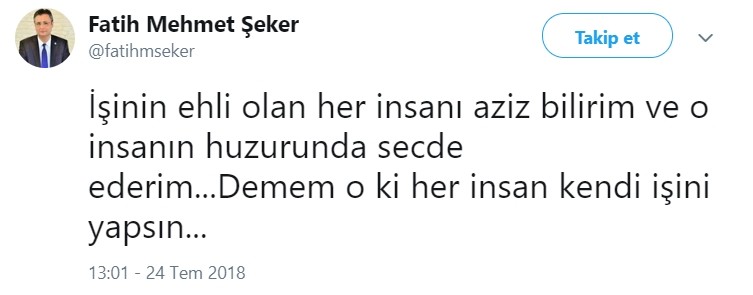 Allah'tan başka kimseye secde edilmeyeceğini emreden İslam dinine göre şirke sokacak olan bir cümle sarfeden Akşener'in yardımcısı Fatih Mehmet Şeker, "İşinin ehli olan her insanı aziz bilirim ve o insanın huzurunda secde ederim...Demem o ki her insan kendi işini yapsın..." ifadelerinde bulundu.