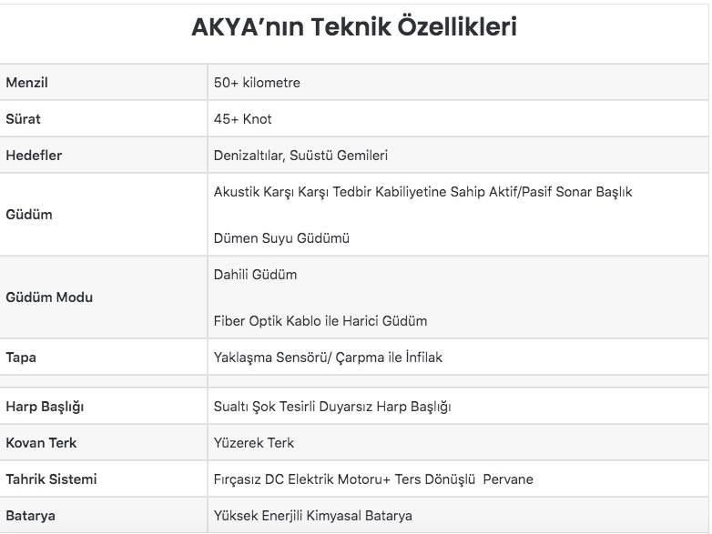Akya torpidosu, ArMerKom, TÜBİTAK ve Roketsan tarafından geliştirilmekte olan yeni nesil, ağır sınıf, uzun menzilli torpidodur. Roketsan tarafından geliştirilen ve Türkiye’nin ilk milli torpidoları olan AKYA Ağır Torpido ile ORKA Hafif Torpido’nun menzil bilgileri revize edildi.