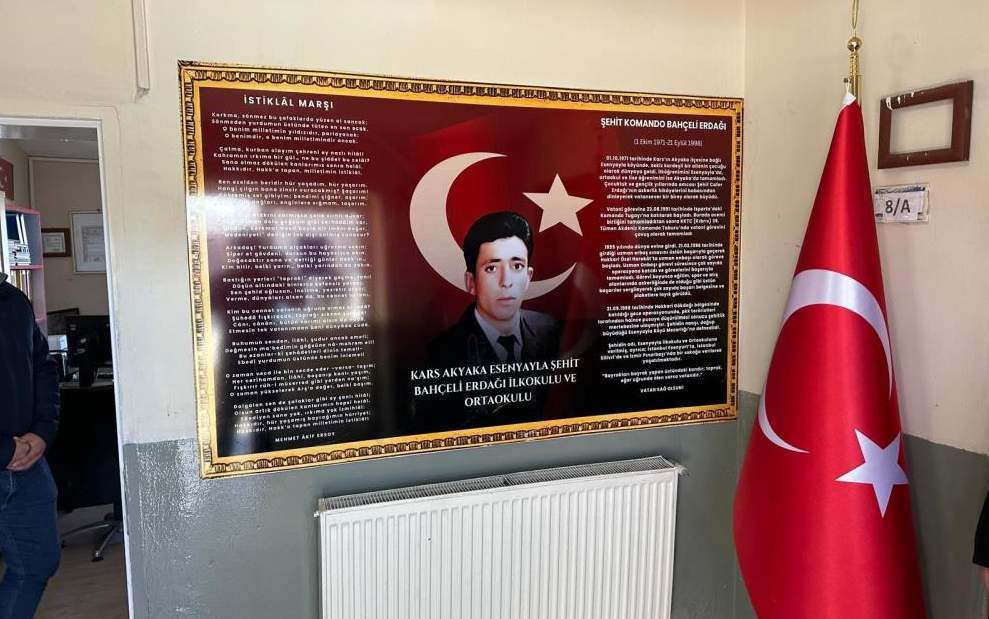 Akyaka’da köy muhtarı ve okul yönetiminden anlamlı davranış. Okul yönetimi ve muhtar, 1998 yılında Hakkari’de şehit olan Komando Bahçeli Erdağı adına okulda köşe oluşturuldu.