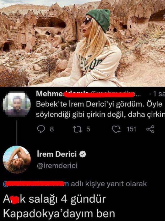 Bir erkek sosyal medya kullanıcısı şarkıcı için "Bebek'te İrem Derici'yi gördüm. Öyle söylendiği gibi çirkin değil, daha çirkin" yorumunu yaptı. Birkaç gündür şehir dışında olan şarkıcı ise yapılan yoruma "A.. salağı 4 gündür Kapadokya'dayım ben" diyerek küfretti.