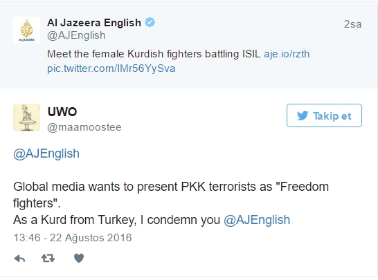 Al-Jazeera'ya tepki gösteren bir Kürt vatandaşı, "Ben Kürdüm. Bu kadınlar bizi temsil etmiyor. Bunlar sadece PYD ve YPG'nin teröristleri. Uluslararası medya, PKK'nın teröristlerini 'Özgürlük savaşçıları" şeklinde servis ediyor. Türkiye'de yaşayan bir Kürt vatandaşı olarak, sizi kınıyorum" dedi.