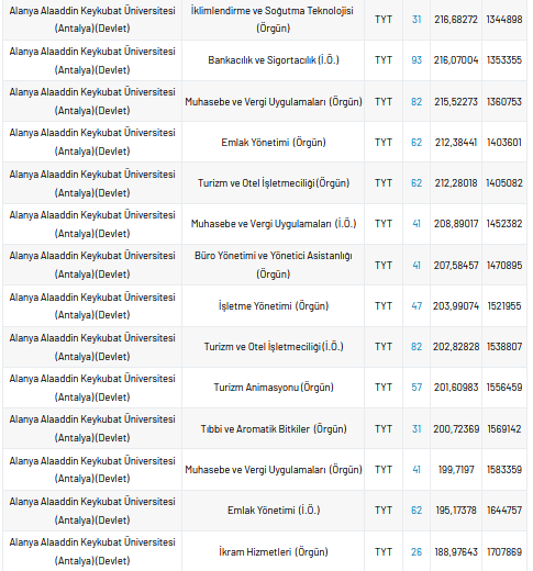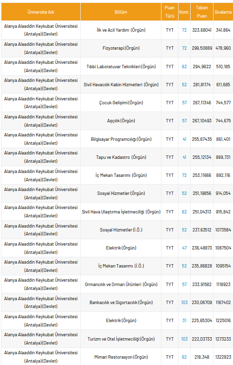 Alanya Alaaddin Keykubat Üniversitesi 2021 taban puanları, yüzdelik dilimleri ve kontenjan sayıları