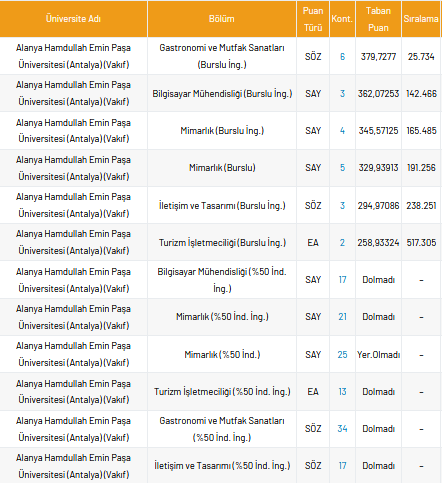 Alanya Hamdullah Emin Paşa Üniversitesi 2021 taban puanları, yüzdelik dilimleri ve kontenjan sayıları