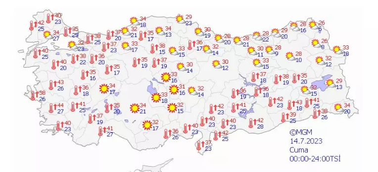 Açıklamada ayrıca, "14 Temmuz Cuma günü etkili olması beklenen sıcak hava dalgası nedeniyle yaşanabilecek güneş çarpması, orman yangınları gibi olumsuzluklara karşı vatandaşlar uyarıldı. Aşırı sıcakların etkili olduğu öğle saatlerinde başta yaşlılar, hamileler, çocuklar, astım ve kalp yetmezliği gibi rahatsızlığı bulunan vatandaşların güneşli ortamda bulunmamaları sağlıkları açısından çok önem taşıyor." ifadelerine de yer verildi.