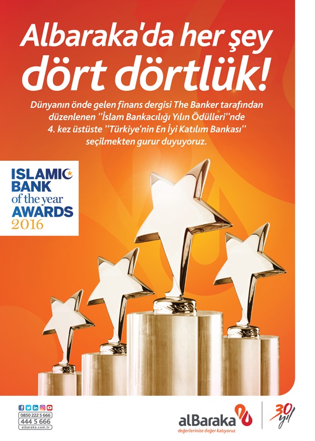 Türkiye’nin ilk katılım bankası Albaraka, The Financial Times Grubu’na ait yayın organı The Banker tarafından verilen “Islamic Bank of The Year 2016” ödüllerinde ‘Türkiye’nin En İyi Katılım Bankası’ ödülüne layık görüldü. Ödülü üst üste 4. kez kazanan Albaraka Türk, Albaraka Bankacılık Grubu ülkeleri arasında ödüle layık görülen tek banka oldu.