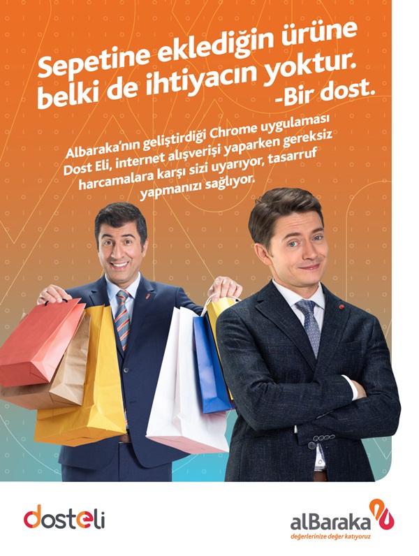 Dünya’nın en iyi katılım bankası olma vizyonuyla hareket eden Albaraka Türk, internet üzerinden yapılan alışverişlerde harcamaları ve bütçeyi korumak için inovatif bir Chromeuygulaması olan “Albaraka Dost Eli” projesinin sponsoru oldu. İnsanların çoğunlukla kullanmayı tercih ettiği tarayıcı olan Chrome üzerinden kolaylıkla ulaşılabilen “Dost Eli”uygulaması, Albaraka Türk’ün müşterisi olsun ya da olmasın bütçesini korumak isteyen herkes tarafından kullanılabiliyor.Üyelik ve kişisel bilgilerinizi girmeden ücretsiz bir şekilde tarayıcınıza eklenebilen uygulamaya http://www.albarakadosteli.com/ websitenden ve http://bit.ly/dostelichrome Google Chrome uygulama marketinden ulaşılabiliyor.