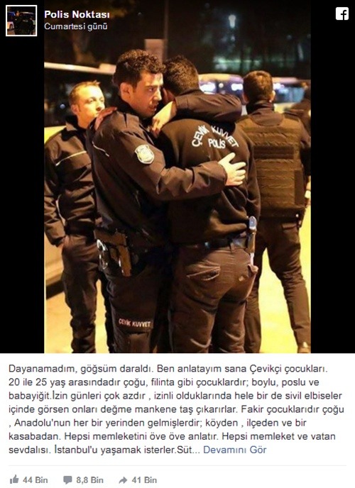 Önceki gece Beşiktaş-Bursaspor maçı sonrası Çevik Kuvvet polisine yapılan alçakça bir saldırı yapıldı. 44 vatandaşın şehit düştüğü alçak saldırı sonrası Türkiye adeta ayağa kalktı. #PolisiminYanındayım hashtagıyla yapılan yorumlar çığ gibi büyüdü. Facebook'ta Polis Noktası adlı sayfadan yapılan paylaşımlar ise okuyanları ağlattı.