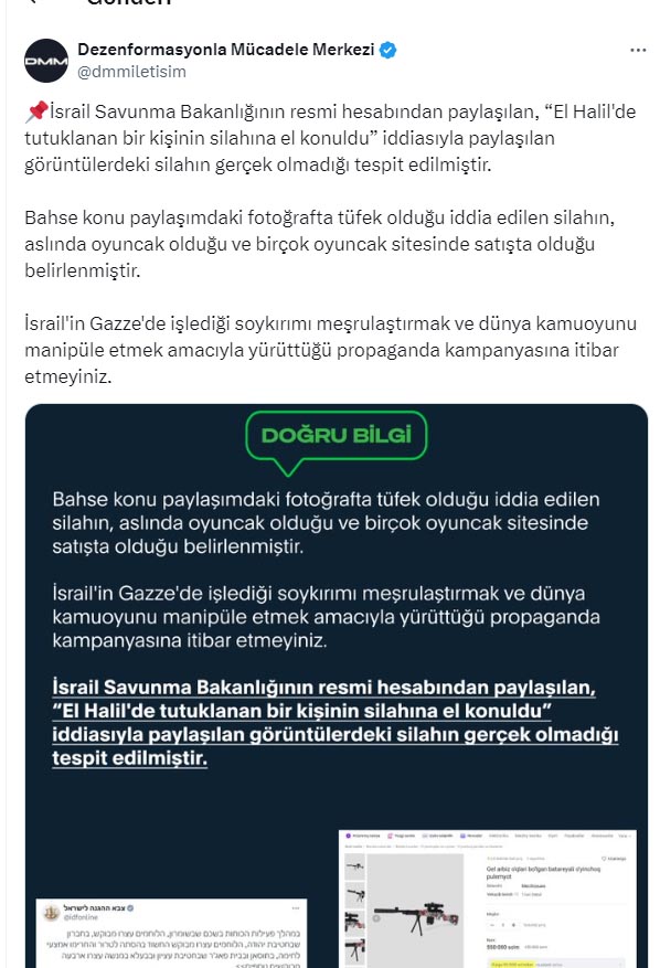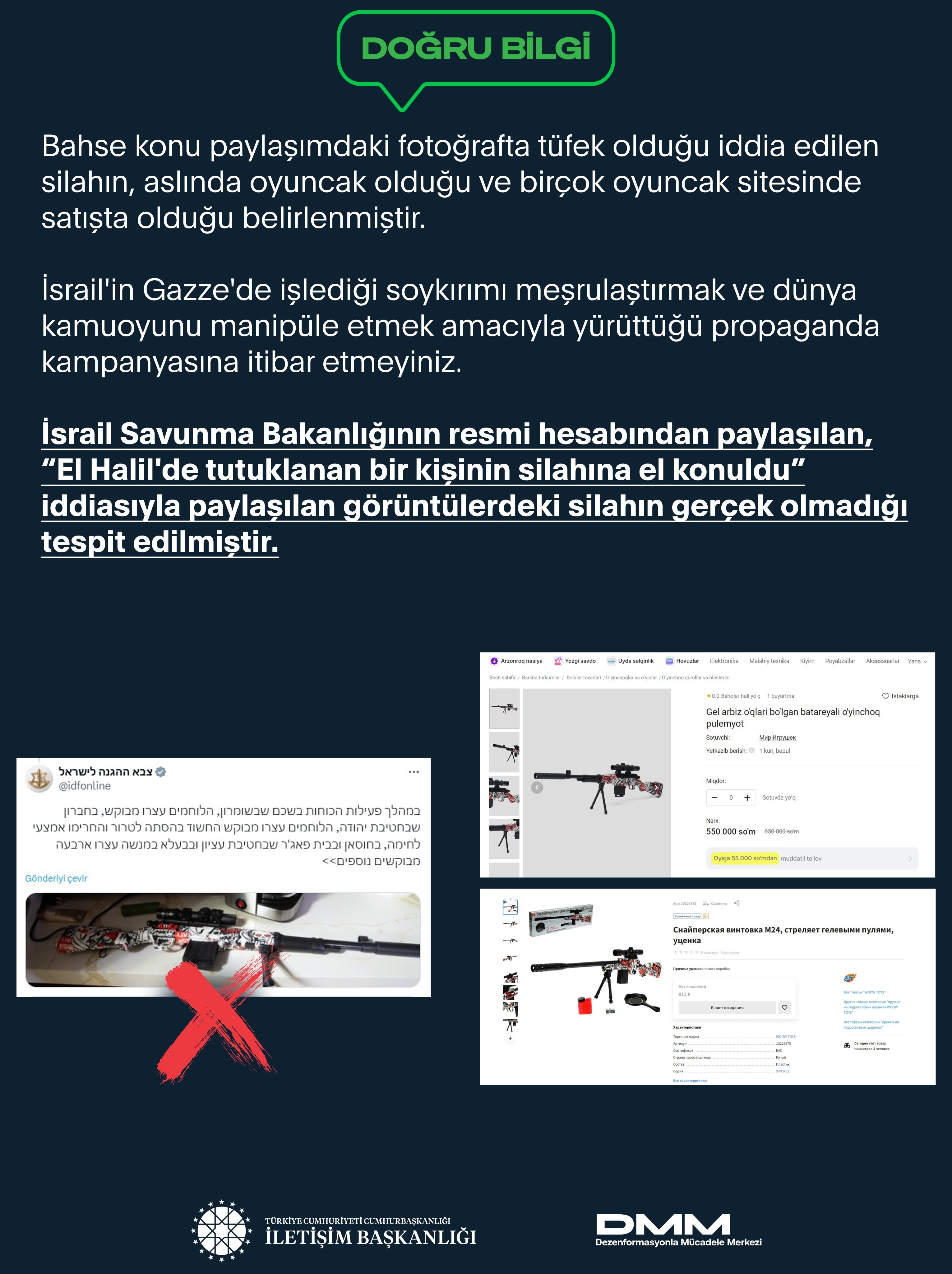 Dezenformasyonla Mücadele Merkezi tarafından yapılan paylaşımda, "İsrail Savunma Bakanlığı'nın resmi hesabından paylaşılan, 'El Halil'de tutuklanan bir kişinin silahına el konuldu' iddiasıyla paylaşılan görüntülerdeki silahın gerçek olmadığı tespit edilmiştir. Bahse konu paylaşımdaki fotoğrafta tüfek olduğu iddia edilen silahın, aslında oyuncak olduğu ve birçok oyuncak sitesinde satışta olduğu belirlenmiştir. İsrail'in Gazze'de işlediği soykırımı meşrulaştırmak ve dünya kamuoyunu manipüle etmek amacıyla yürüttüğü propaganda kampanyasına itibar etmeyiniz" denildi. (DHA)