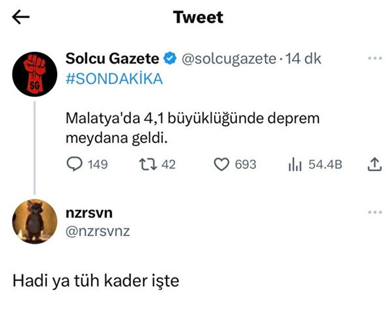 Cumhurbaşkanı Recep Tayyip Erdoğan'ın seçimlerde deprem bölgesinden yüksek oranda oy almasını hazmedemeyen muhalif seçmenler, kin ve nefret kusmaya devam ediyor. Hazımsız güruh bugün Malatya'da meydana gelen depremin ardından depremzedelere yönelik küfür ve tehditlerine devam etti.