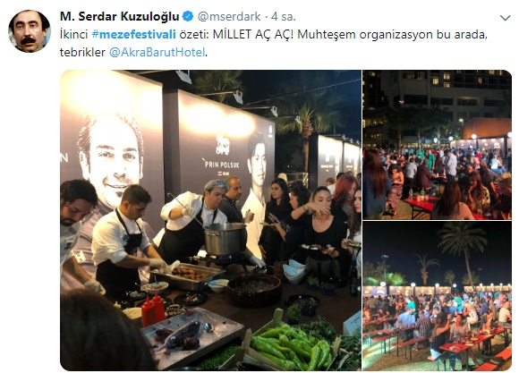 Twitter'ın 'İnternet ekipler amiri' mahlaslı teknoloji yazarı Serdar Kuzuloğlu da festivale katılanlar arasındaydı. Kuzuloğlu, festivale ilişkin Twitter'dan, "İkinci #mezefestivali özeti: MİLLET AÇ AÇ!" paylaşımını yaptı.