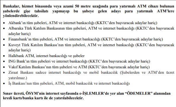 Sınav ücreti ödeme işlemleri, sınava başvuru süresi bittikten sonraki ilk gün, banka şubelerinden ödeme yapacak olan adaylar için mesai saati bitiminde, ÖSYM’nin internet sayfasında eİŞLEMLER’de yer alan “ÖDEMELER” alanından kredi kartı/banka kartı ile ödeme yapacak adaylar ile banka ATM’leri ve online bankacılık üzerinden ödeme yapacak adaylar için saat 23.59’da sona erecektir. Bankadan ödeme yapacak adayların, bankaların çalışma saatlerini göz önünde bulundurmaları gerekmektedir.