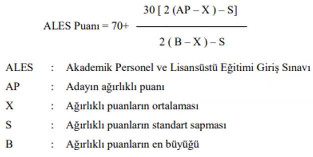 Akademik Personel ve Lisansüstü Eğitimi Giriş Sınavının kısaltmasıdır. Daha çok yüksek lisans başvuruları için gerektiği sanılmasına rağmen, doktora başvuruları için de girilmesi gereken bir testtir. ALES sınavına katılan adayların her testteki sorulara verdikleri doğru ve yanlış cevaplar ayrı ayrı toplanacak, doğru cevap sayısından yanlış cevap sayısının dörtte biri çıkarılarak ham puanlar elde edilecektir. Her test için sınavı geçerli tüm adayların ham puanlarının ortalaması ve standart sapması ayrı ayrı hesaplanarak adayların ham puanları, ortalaması 50, standart sapması 10 olan standart puanlara dönüştürülecektir.