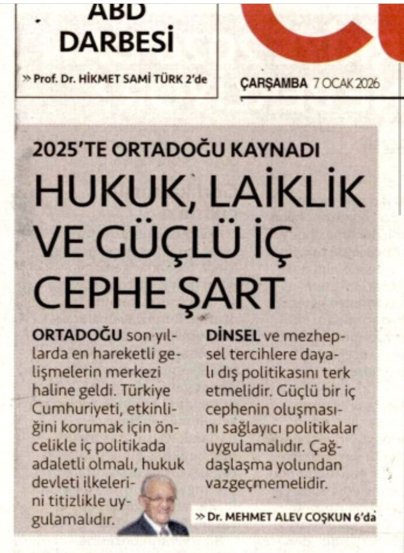 Cumhuriyet gazetesi yönetimi ve Alev Coşkun, Başkan Erdoğan’ın Türkiye’nin bekası için yaptığı "iç cepheyi güçlendirmeliyiz" çağrılarını her fırsatta eleştirip görmezden geliyordu. Ancak 2026’nın başında ABD’nin Venezuela’ya yönelik barbarca müdahalesi ve Maduro’nun kaçırılması, laiklik maskesi altına sığınan bu isimleri bir anda "hizaya" getirdi. Coşkun, dış dünyadaki vahşi emperyalizmi görünce "güçlü bir iç cephe" oluşmasının şart olduğunu itiraf etmek zorunda kaldı.