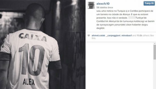Alex De Souza Instagram hesabından yaptığı açıklamada, "Türkiye'de Coritiba'nın Alanya'da bir turnuvaya katılacağı ve benim de oynayacağım yönündeki çıkan haberler doğru değildir" şeklinde konuştu. Alex, basında çıkan iddiaları kendi ağzından yalanladı.