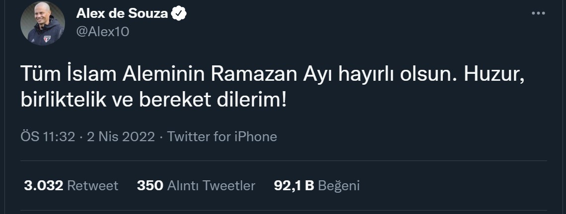 Fenerbahçe Futbol Takımı tarihine geçen efsane kaptan Alex de Souza, Ramazan-ı Şerif’in gelişi dolayısıyla Twitter hesabından bir mesaj yayınladı.