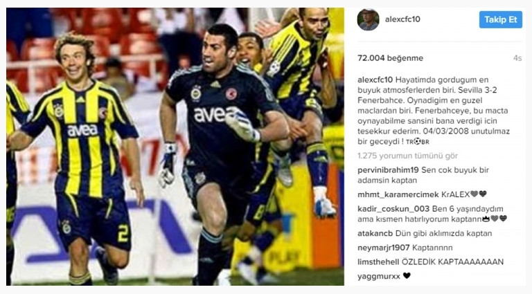 Fenerbahçe ile efsaneleşen eski Brezilyalı futbolcu Alex de Souza, Instagram hesabından duygusal bir paylaşımda bulundu. Sarı-lacivertlilerin, 2007-2008 Şampiyonlar Ligi sezonunda, deplasmanda 3-2’lik skorun ardından penaltı atışları sonucu elediği Sevilla maçından bir kare paylaşan Alex, "Hayatımda gördüğüm en buyuk atmosferlerden biri. Sevilla 3-2 Fenerbahce. Oynadığım en güzel maçlardan biri. Fenerbahçe’ye, bu maçta oynayabilme şansını bana verdiği için teşekkür ederim. 04/03/2008 unutulmaz bir geceydi" ifadelerini kullandı.