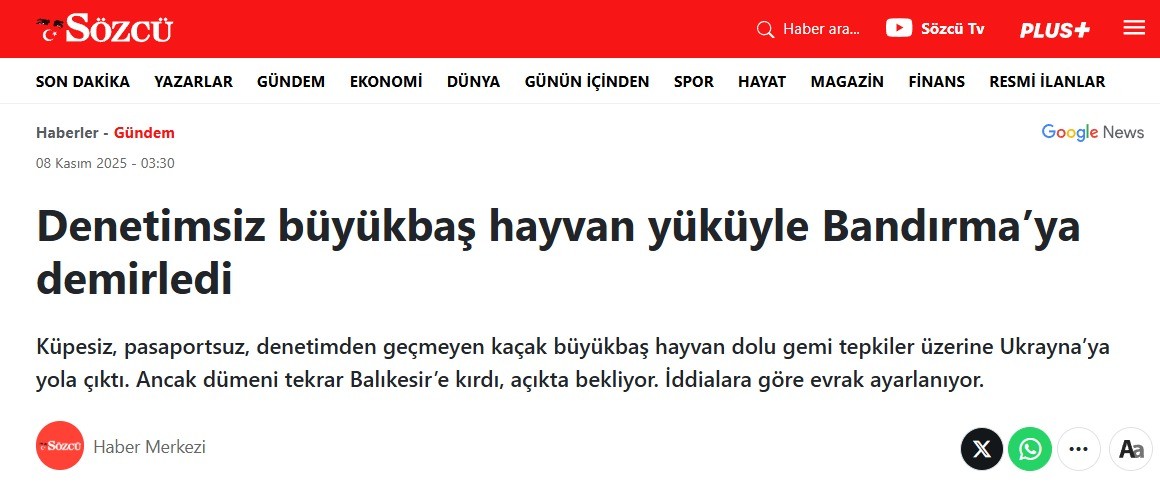 İletişim Başkanlığı Dezenformasyonla Mücadele Merkezi (DMM), bazı basın organlarında ve sosyal medya platformlarında yer alan, 'Bandırma Limanı'nda kaçak ve kimliksiz büyükbaş hayvanların yasa dışı şekilde ülkeye sokulmaya çalışıldığı, hayvanların açlıktan öldüğü ve geminin gizlice limana geri döndüğü' yönündeki iddiaların gerçeği yansıtmadığını duyurdu.