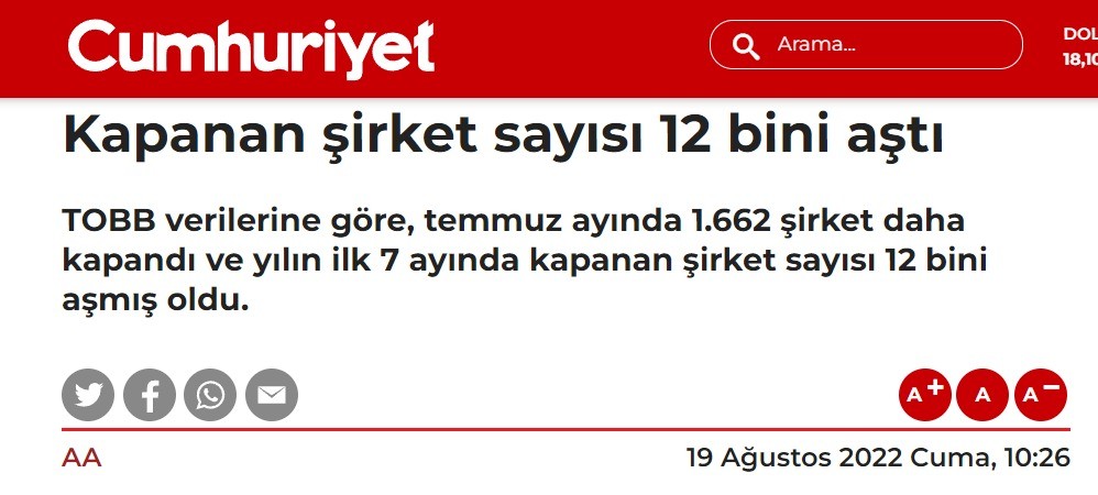 Türkiye Odalar ve Borsalar Birliği, Türkiye'de kurulan ve kapanan şirket verilerini açıkladı. Açıklanan verilere göre kurulan şirket sayısı yüzde 23 arttı. Cumhuriyet gazetesi, sadece kapanan şirket sayılarını yayınlayarak yine ekonomi bitti algısı oluşturmaya kalkıştı.