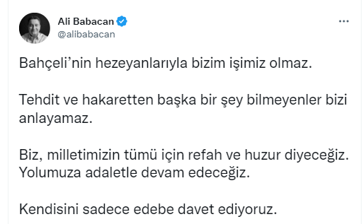 Devlet Bahçeli'nin açıklamalarını Twitter hesabından hedef alan Al Babacan, "Bahçeli’nin hezeyanlarıyla bizim işimiz olmaz. Tehdit ve hakaretten başka bir şey bilmeyenler bizi anlayamaz." dedi.