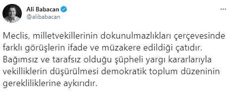 Ali Babacan, HDP'li Ömer Faruk Gergerlioğlu ile ilgili yaptığı açıklamada ise, "Meclis, milletvekillerinin dokunulmazlıkları çerçevesinde farklı görüşlerin ifade ve müzakere edildiği çatıdır. Bağımsız ve tarafsız olduğu şüpheli yargı kararlarıyla vekilliklerin düşürülmesi demokratik toplum düzeninin gerekliliklerine aykırıdır." dedi.