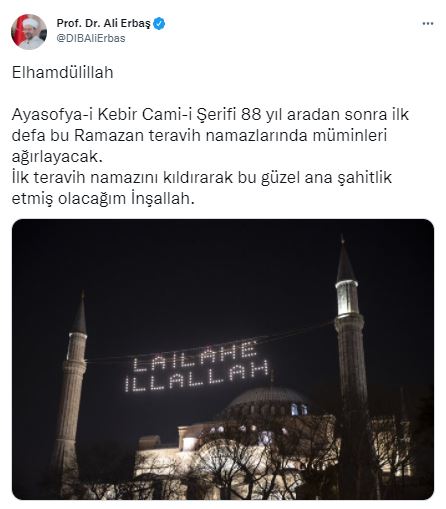88 yıl sonra kılınacak olan ilk teravih namazında Ayasofya-i Kebir Cami-i Şerifi'nde olacağını sosyal medya hesaplarından duyuran Diyanet İşleri Başkanı Erbaş, paylaşımında şu ifadelere yer verdi: