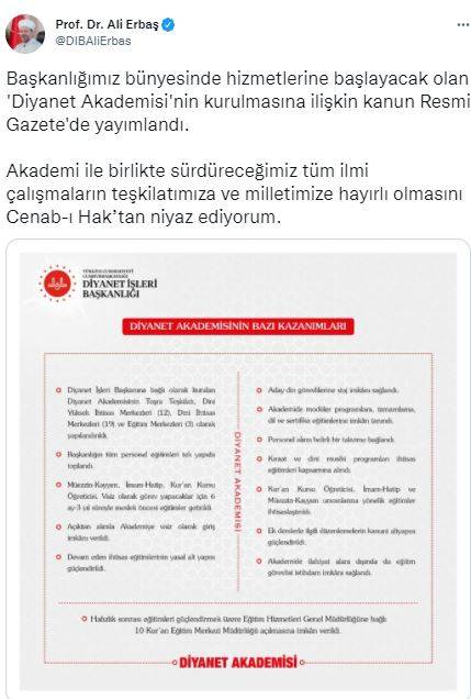 Diyanet İşleri Başkanı Erbaş, sosyal medya hesaplarından yayınladığı mesajında şu ifadelere yer verdi: “Başkanlığımız bünyesinde hizmetlerine başlayacak olan 'Diyanet Akademisi'nin kurulmasına ilişkin kanun Resmi Gazete’de yayımlandı. Akademi ile birlikte sürdüreceğimiz tüm ilmi çalışmaların teşkilatımıza ve milletimize hayırlı olmasını Cenab-ı Hak’tan niyaz ediyorum.”
